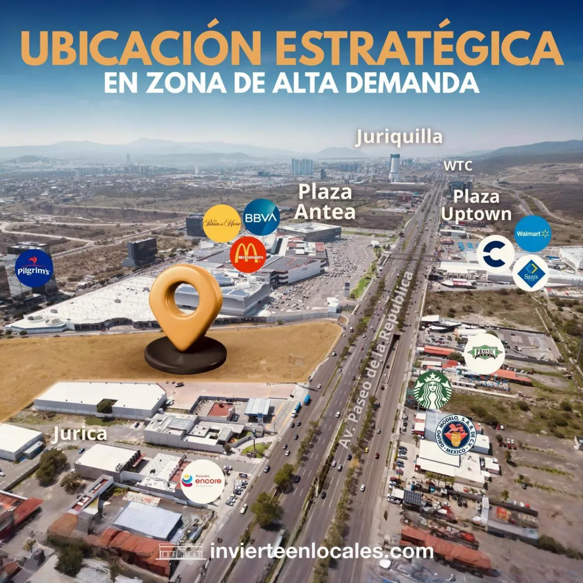 Zona altamente comercial: Palacio de Hierro, Liverpool, Walmart, SAMS, AC Hotel, Holiday Inn, Aloft Hotel, City Express.